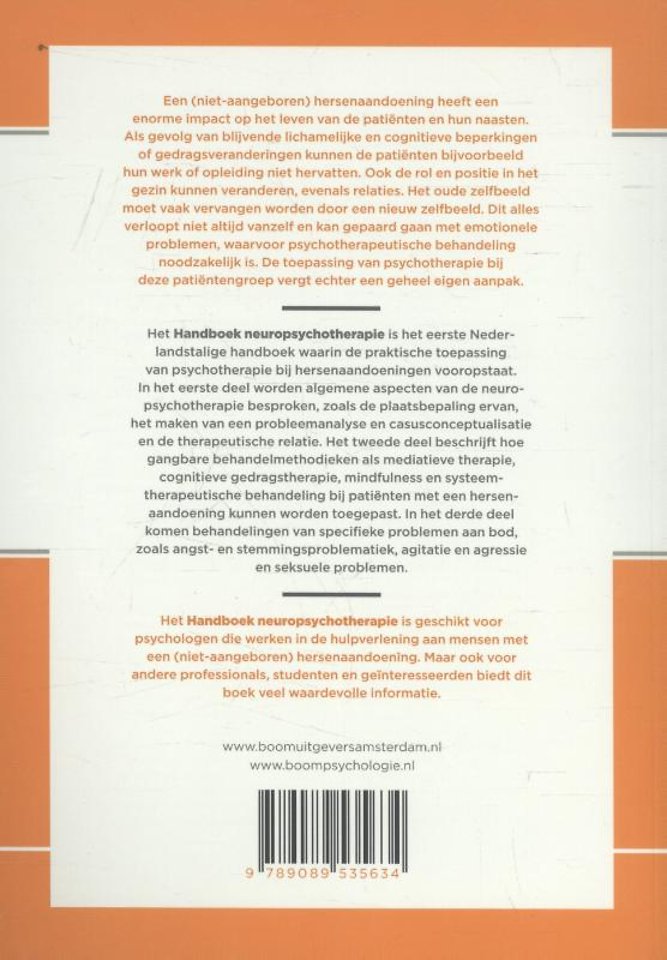 Het Handboek neuropsychotherapie is het eerste Nederlandstalige handboek waarin de praktische toepassing van psychotherapie bij hersenaandoeningen vooropstaat. In het eerste deel worden algemene aspecten van de neuro-psychotherapie besproken, zoals de plaatsbepaling ervan, het maken van een probleemanalyse en casusconceptualisatie en de therapeutische relatie. Het tweede deel beschrijft hoe gangbare behandelmethodieken als mediatieve therapie, cognitieve gedragstherapie, mindfulness en systeemtherapeutische behandeling bij patiënten met een hersenaandoening kunnen worden toegepast. In het derde deel komen behandelingen van specifieke problemen aan bod, zoals angst- en stemmingsproblematiek, agitatie en agressie en seksuele problemen.
