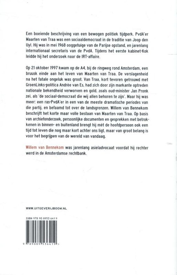Op 21 oktober 1997 kwam op de A4, vlak bij de ringweg rond Amsterdam, een bruusk einde aan het leven van Maarten van Traa. De verslagenheid na het fatale ongeluk was groot. Van Traa, kort tevoren getrouwd met GroenLinks-politica Andrée van Es, was populair en gold, zoals oud-minister Jan Pronk zei, als 'de sociaal-democraat die wij allen behoren te zijn'. Hij werd beroemd als de onkreukbare voorzitter van de parlementaire enquêtecommissie die zich met de IRT-affaire bezighield. Maar hij was meer: een ras-PvdA'er in de hoogtijdagen van die partij, befaamd tot ver over de landsgrenzen.