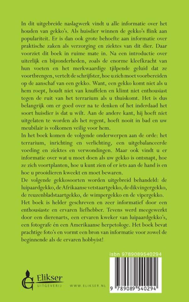 In dit uitgebreide naslagwerk vindt u alle informatie over het houden van gekkos. Als huisdier winnen de gekkos flink aan populariteit. Er is dan ook grote behoefte aan informatie over praktische zaken als verzorging en ziektes van dit dier. Daar voorziet dit boek in ruime mate in. Na een introductie over uiterlijk en bijzonderheden, zoals de enorme kleefkracht van hun voeten en het merkwaardige tjilpende geluid dat ze voortbrengen, vertelt de schrijfster, hoe u zich moet voorbereiden op de aanschaf van een gekko. Want, een gekko komt niet als u hem roept, houdt niet van knuffelen en klimt niet enthousiast tegen de ruit van het terrarium als u thuiskomt. Het is dus belangrijk om er goed over na te denken of het inderdaad het soort huisdier is dat u wilt. Aan de andere kant, hij hoeft niet uitgelaten te worden als het regent, hoeft nooit in bad en uw meubilair is volkomen veilig voor hem.