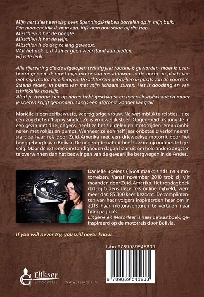 Lingerie en Motorleer is haar debuutboek, geïnspireerd op de motorreis door Bolivia.