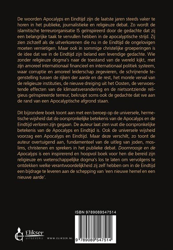Dit bijzondere boek toont aan met een beroep op de universele, hermetische wijsheid dat de oorspronkelijke betekenis van de Apocalyps en de Eindtijd verloren zijn gegaan. De auteur laat zien wat die oorspronkelijke betekenis van de Apocalyps en Eindtijd is. Ook de universele wijsheid voorzag een Apocalyps en Eindtijd. Maar deze verschilt, zo toont de auteur overtuigend aan, fundamenteel van de uitleg van joden, moslims, christenen en sprekers in het publieke debat. Doornroosje en de Apocalyps is een inspirerend en hoopvol boek voor hen die bereid zijn religieuze en wetenschappelijke dogma's los te laten om vervolgens te ontdekken welke verantwoordelijkheid zij zelf hebben om in de Eindtijd een bijdrage te leveren aan de schepping van 'een nieuwe hemel en een nieuwe aarde'.