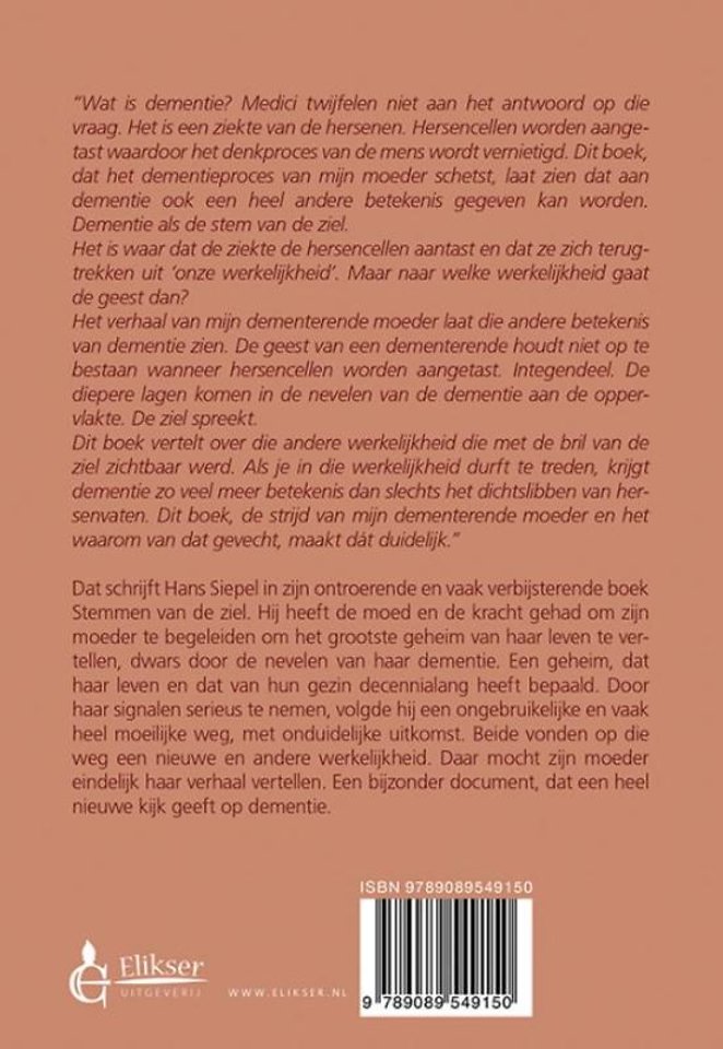 Dat schrijft Hans Siepel in zijn ontroerende en vaak verbijsterende boek Stemmen van de ziel. Hij heeft de moed en de kracht gehad om zijn moeder te begeleiden om het grootste geheim van haar leven te vertellen, dwars door de nevelen van haar dementie. Een geheim, dat haar leven en dat van hun gezin decennialang heeft bepaald. Door haar signalen serieus te nemen, volgde hij een ongebruikelijke en vaak heel moeilijke weg, met onduidelijke uitkomst. Beide vonden op die weg een nieuwe en andere werkelijkheid. Daar mocht zijn moeder eindelijk haar verhaal vertellen. Een bijzonder document, dat een heel nieuwe kijk geeft op dementie.
