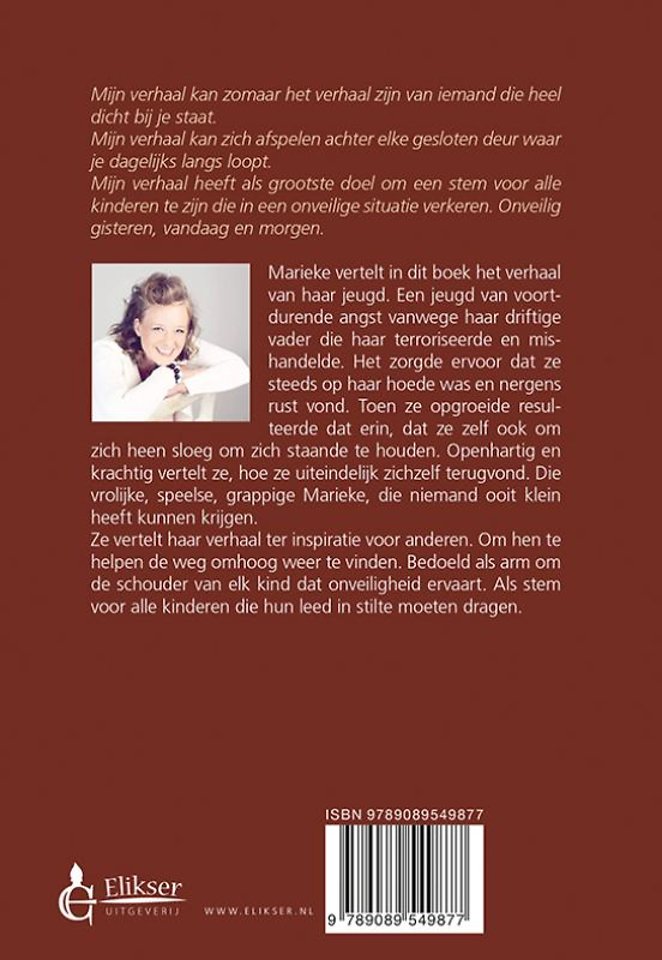Marieke vertelt in dit boek het verhaal van haar jeugd. Een jeugd van voortdurende angst vanwege haar driftige vader die haar terroriseerde en mishandelde. Het zorgde ervoor dat ze steeds op haar hoede was en nergens rust vond. Toen ze opgroeide resulteerde dat erin, dat ze zelf ook om zich heen sloeg om zich staande te houden. Openhartig en krachtig vertelt ze, hoe ze uiteindelijk zichzelf terugvond. Die vrolijke, speelse, grappige Marieke, die niemand ooit klein heeft kunnen krijgen.