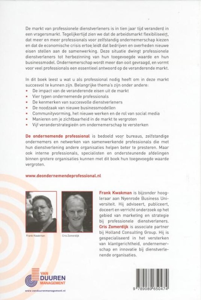 'De ondernemende professional' is bedoeld voor bureaus, zelfstandige ondernemers en netwerken van samenwerkende professionals die met hun dienstverlening andere organisaties helpen beter te presteren. Maar ook interne professionals, specialisten en ondersteunende afdelingen binnen grotere organisaties kunnen met dit boek hun toegevoegde waarde vergroten.