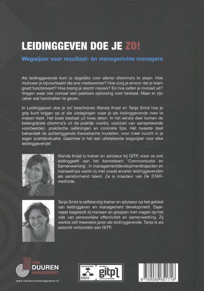 In 'Leidinggeven doe je zo!' beschrijven Wanda Kraal en Tanja Smid hoe u grip kunt krijgen op al die uitdagingen waar u als leidinggevende mee te maken hebt. Het boek bestaat uit twee delen. In het eerste deel komen de belangrijkste dilemma's uit de praktijk voorbij, voorzien van aansprekende voorbeelden, praktische oefeningen en concrete tips. Het tweede deel behandelt de achterliggende theoretische modellen, voor meer inzicht in uw eigen praktijksituatie. Daarmee is het een uitstekende wegwijzer voor elke leidinggevende!