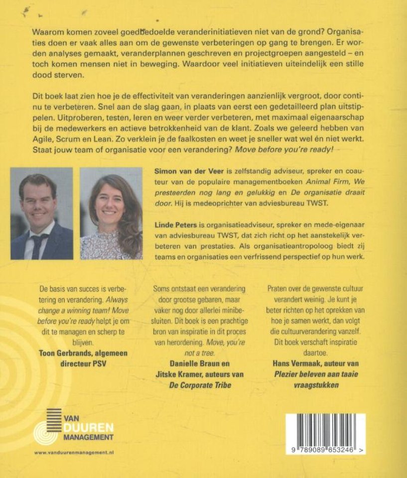 Dit boek laat zien hoe je de effectiviteit van veranderingen aanzienlijk vergroot, door continu te verbeteren. Snel aan de slag gaan, in plaats van eerst een gedetailleerd plan uitstippelen. Uitproberen, testen, leren en weer verder verbeteren, met maximaal eigenaarschap bij de medewerkers en actieve betrokkenheid van de klant. Zoals we geleerd hebben van Agile, Scrum en Lean. Zo verklein je de faalkosten en weet je sneller wat wel én niet werkt. Staat jouw team of organisatie voor een verandering? Move before you’re ready!