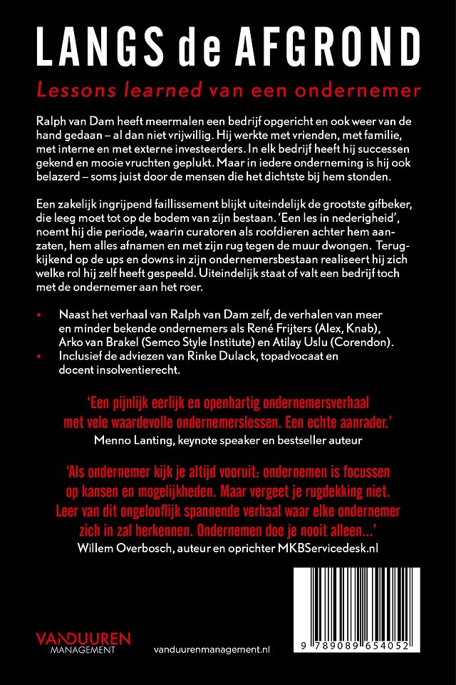 - Naast het verhaal van Ralph van Dam zelf, de verhalen van meer en minder bekende ondernemers als René Frijters (Alex, Knab), Arko van Brakel (Semco Style Institute) en Atilay Uslu (Corendon).