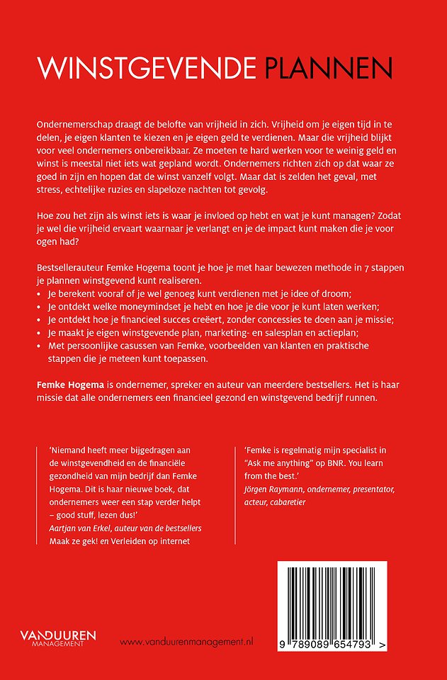 Meer over Femke HogemaOndernemerschap draagt de belofte van vrijheid in zich. Vrijheid om je eigen tijd in te delen, je eigen klanten te kiezen en je eigen geld te verdienen. Maar die vrijheid blijkt voor veel ondernemers onbereikbaar. Ze moeten te hard werken voor te weinig geld en winst is meestal niet iets wat gepland wordt. Ondernemers richten zich op dat waar ze goed in zijn en hopen dat de winst vanzelf volgt. Maar dat is zelden het geval, met stress, echtelijke ruzies en slapeloze nachten tot gevolg.