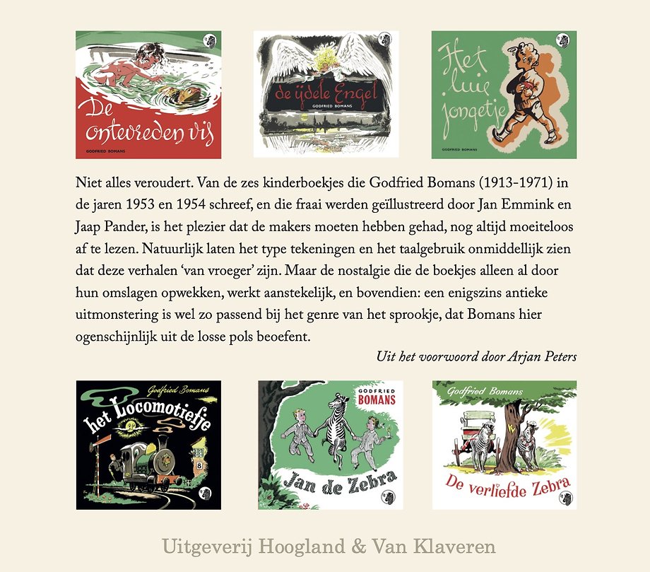 Niet alles veroudert. Van de zes kinderboekjes die Godfried Bomans (1913-1971) in de jaren 1953 en 1954 schreef, en die fraai werden geïllustreerd door Jan Emmink en Jaap Pander, is het plezier dat de makers moeten hebben gehad nog altijd moeiteloos af te lezen. Natuurlijk laten het type tekeningen en het taalgebruik onmiddellijk zien dat deze verhalen ‘van vroeger’ zijn. Maar de nostalgie die de boekjes alleen al door hun omslagen opwekken, werkt aanstekelijk, en bovendien: een enigszins antieke uitmonstering is wel zo passend bij het genre van het sprookje, dat Bomans hier ogenschijnlijk uit de losse pols beoefent.