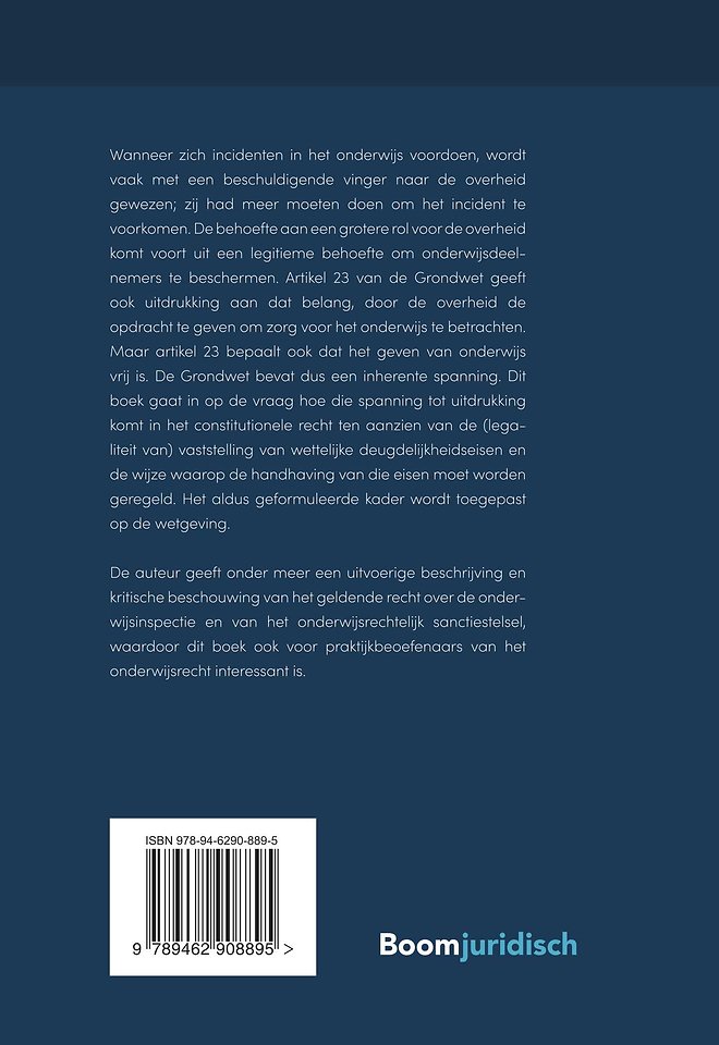 onderwijsrecht constitutioneel recht onderwijsvrijheid onderwijsinspectie deugdelijkheidseisen legaliteitsbeginsel artikel 23 grondwet toezicht handhaving sancties grondwet wetgeving primaat van de wet bestuursrecht delegatie onderwijs onderwijswetgever overheid regelgeving proportionaliteit subsidiariteit beperkingsclausules machtenverdeling