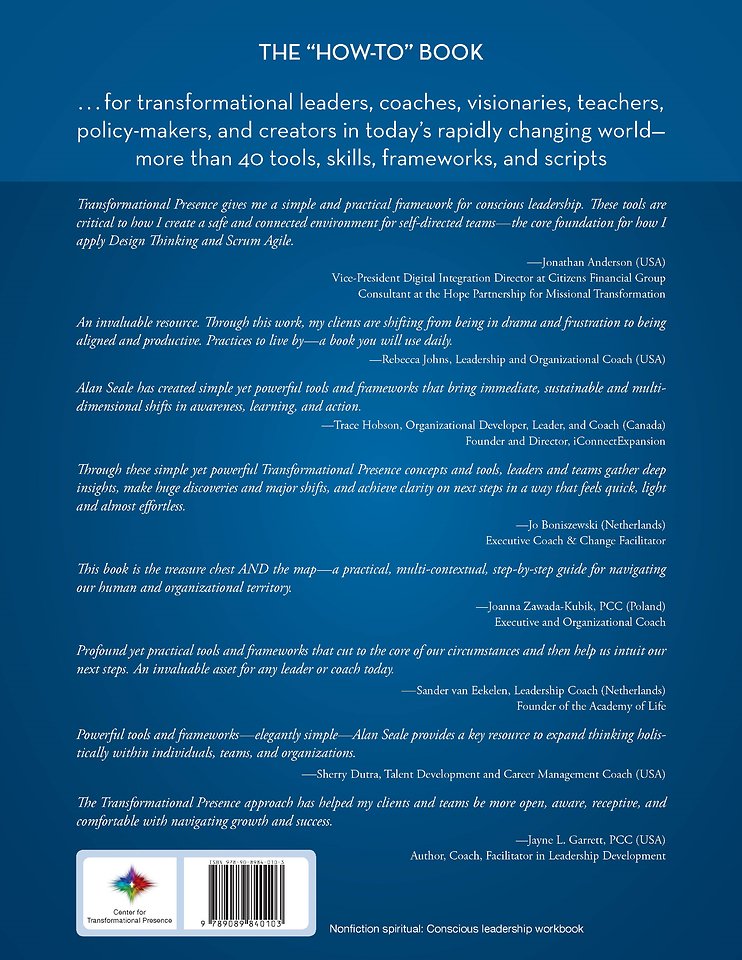 In deel twee worden de belangrijkste begrippen uit Transformational Presence samengevat. De aanpak van Seale draait om drie vragen. Wat wil er gebeuren? Wie vraagt het mij te zijn? Wat wil het dat ik doe? Transformational Presence betekent dat we ons bewust moeten zijn van wat er wil ontstaan, hoe het wil dat we ons laten zien, en hoe het ons vraagt te verbinden. Ook komen de onderliggende principes aan bod. Alles is energie in beweging – een proces dat zich ontvouwt en vorm volgt energie. Energie kan niet worden gecreëerd of vernietigd; ze kan alleen worden getransformeerd. En het universum is gebouwd op een matrix van relaties. Ook beschrijft de auteur kort het denken met heel ons geestelijk vermogen en het bewust zijn met ons hele wezen. En hoe we van transactioneel naar transformationeel naar ‘transformactioneel’ werken komen. Dat laatste is vooral nodig om in tijden van snelle veranderingen onmiddellijk met een antwoord of een actie te komen. Tot slot komen de vier archetypen voorbij die samen het nieuwe paradigma vormen van transformactioneel leiderschap: de ziener, de ontdekker, de co-schepper en de ambassadeur. In deel drie zijn bijna vijftig oefeningen en denkramen uitgewerkt om mee aan de slag te gaan en invulling te geven aan een van de vier archetypen.