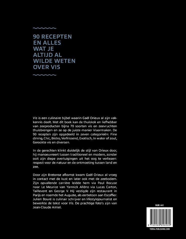 Vis is een culinaire bijbel waarin Gaël Orieux al zijn vakkennis deelt. Met dit boek kan de thuiskok en liefhebber van zeeproducten bijna 70 soorten vis en zeevruchten thuisbrengen en ze op de juiste manier klaarmaken. De 90recepten zijn opgedeeld in zeven categorieën: Fine dining, Chic, Bistro, Verfrissend, Exotisch, In water of zout, Gerookte vis en diversen.