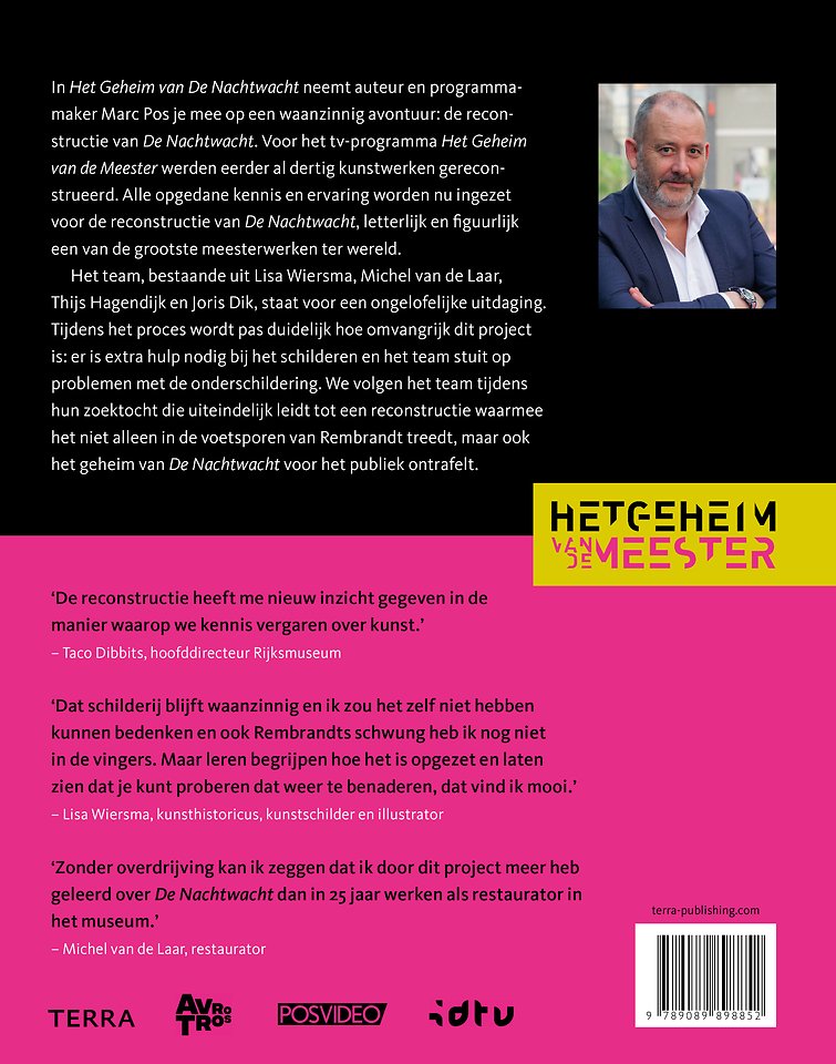 In 'Het Geheim van De Nachtwacht' neemt auteur en programmamaker Marc Pos je mee op een waanzinnig avontuur: de reconstructie van De Nachtwacht. Voor het tv-programma 'Het Geheim van de Meester' werden eerder al dertig kunstwerken gereconstrueerd. Alle opgedane kennis en ervaring worden nu ingezet voor de reconstructie van De Nachtwacht, letterlijk en figuurlijk een van de grootste meesterwerken ter wereld.
