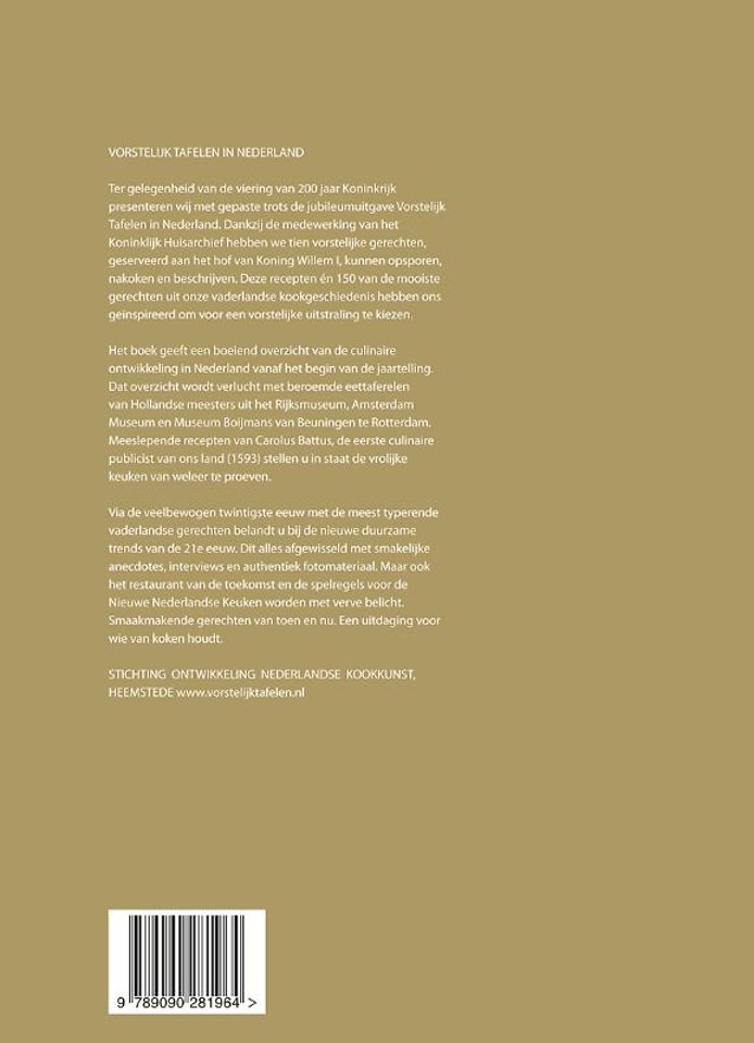 Ter gelegenheid van de viering van 200 jaar Koninkrijk presenteert Stichting Ontwikkeling Nederlandse Kookkunst de jubileumuitgave Vorstelijk Tafelen in Nederland. Een unieke beschrijving van de vaderlandse kookgeschiedenis, boordevol vorstelijke gerechten! Laat u verrassen of verras uw vriend, vriendin, relatie of familie met een kostelijk verhaal over de Nederlandse kookkunst met vorstelijke gerechten van Koning Willem I in de hoofdrol!