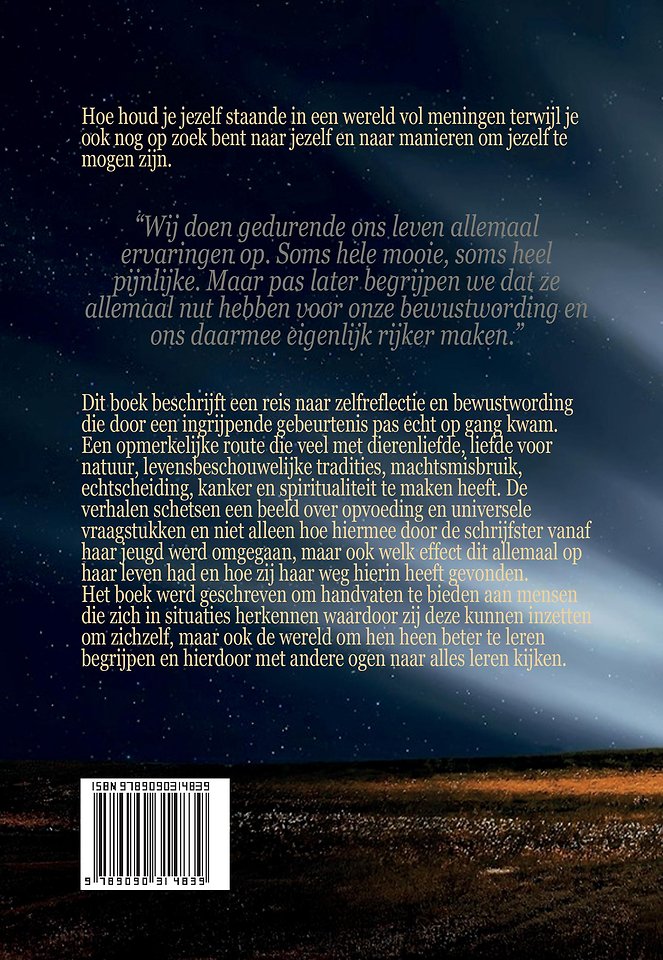 Dit boek beschrijft een reis naar zelfreflectie en bewustwording die door een ingrijpende gebeurtenis pas echt op gang kwam. Een opmerkelijke route die veel met dierenliefde, liefde voor natuur, levensbeschouwelijke tradities, machtsmisbruik, echtscheiding, kanker en spiritualiteit te maken heeft. De verhalen schetsen een beeld over opvoeding en universele vraagstukken en niet alleen hoe hiermee door de schrijfster vanaf haar jeugd werd omgegaan, maar ook welk effect dit allemaal op haar leven had en hoe zij haar weg hierin heeft gevonden.