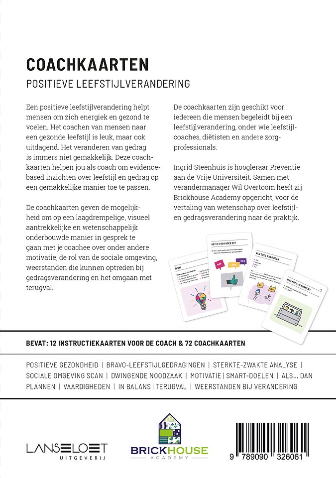 Een positieve leefstijlverandering helpt mensen om zich energiek en gezond te voelen. Het coachen van mensen naar een gezonde leefstijl is leuk, maar ook uitdagend. Het veranderen van gedrag is immers niet gemakkelijk. Deze coachkaarten helpen jou als coach om evidence-based inzichten over leefstijl en gedrag op een gemakkelijke manier toe te passen.