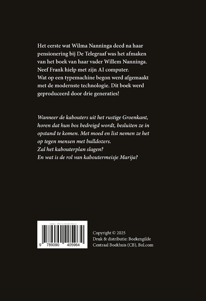 Het kabouterboek is het werk van drie generaties en een AI computer. Wat is begonnen op de typemachine van Willem Nanninga is afgemaakt met behulp van de hedendaagse technologie. Nadat zij als nieuwsregisseur bij De Telegraaf met pensioen ging, schreef Wilma Nanninga aan het kabouterboek en zij zette ook Frank Nanninga en zijn AI computer in. Frank ontwierp de illustraties in het boek: geen dikbuikige kabouters dus, maar filmische, atletische en gespierde heel kleine mensen.