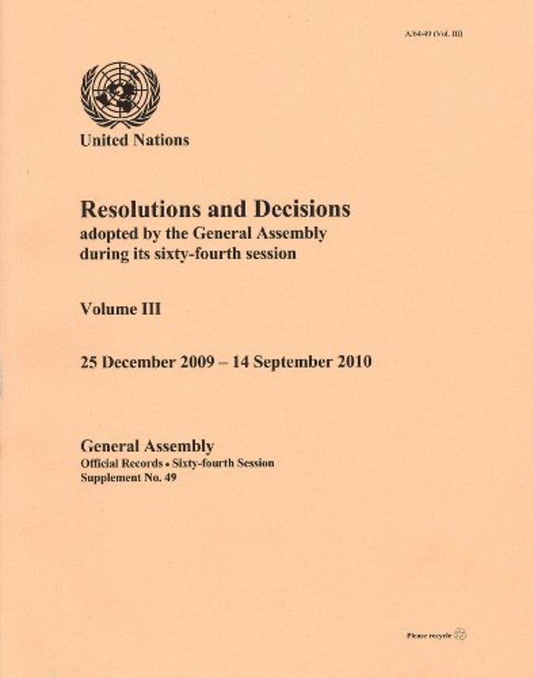 Resolutions and Decisions Adopted by the General – Sixty–fourth Session, Volume three, 25 December 2009 to 14 September 2010