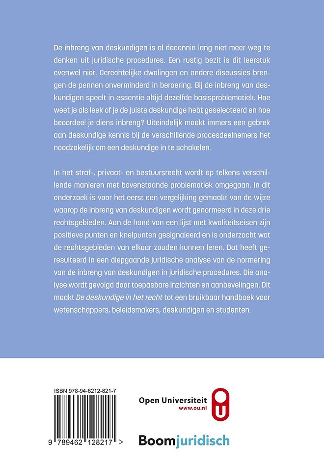 In het straf-, privaat- en bestuursrecht wordt op telkens verschillende manieren met bovenstaande problematiek omgegaan. In dit onderzoek is voor het eerst een vergelijking gemaakt van de wijze waarop de inbreng van deskundigen wordt genormeerd in deze drie rechtsgebieden. Aan de hand van een lijst met kwaliteitseisen zijn positieve punten en knelpunten gesignaleerd en is onderzocht wat de rechtsgebieden van elkaar zouden kunnen leren. Dat heeft geresulteerd in een diepgaande juridische analyse van de normering van de inbreng van deskundigen in juridische procedures. Die analyse wordt gevolgd door toepasbare inzichten en aanbevelingen. Dit maakt De deskundige in het recht tot een bruikbaar handboek voor wetenschappers, beleidsmakers, deskundigen en studenten.