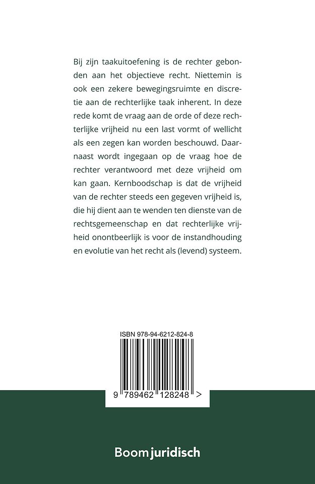 Bij zijn taakuitoefening is de rechter gebonden aan het objectieve recht. Niet temin is ook een zekere bewegingsruimte en discretie aan de rechterlijke taak inherent. In deze rede komt de vraag aan de orde of deze rechterlijke vrijheid nu een last vormt of wellicht als een zegen kan worden beschouwd. Daarnaast wordt ingegaan op de vraag hoe de rechter verantwoord met deze vrijheid om kan gaan. Kern boodschap is dat de vrijheid van de rechter steeds een gegeven vrijheid is, die hij dient aan te wenden ten dienste van de rechts gemeenschap en dat rechterlijke vrijheid onontbeerlijk is voor de instandhouding en evolutie van het recht als (levend) systeem.