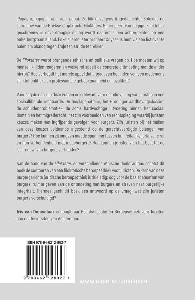 Aan de hand van de Filoktetes en verschillende ethische denktradities schetst dit boek de contouren van een filoktetische beroepsethiek voor juristen. De kern van deze burgergerichte juridische beroepsethiek is drieledig: oog voor de basisbehoeften van burgers, ruimte geven aan de ontmoeting met burgers en streven naar burgerlijke integriteit. Hiermee geeft dit boek een antwoord op de vraag: wat zijn juristen burgers verschuldigd?
