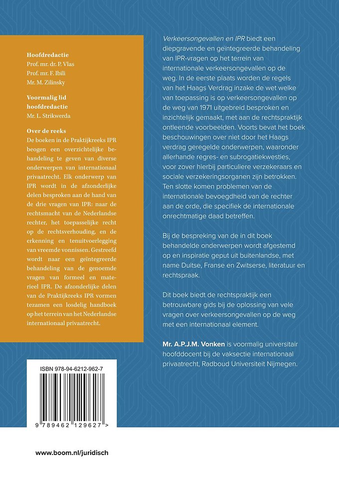 Verkeersongevallen en IPR biedt een diepgravende en geïntegreerde behandeling van IPR-vragen op het terrein van internationale verkeersongevallen op de weg. In de eerste plaats worden de regels van het Haags Verdrag inzake de op het verkeersongeval op de weg toepasselijke wet van 1971 uitgebreid besproken en inzichtelijk gemaakt, met aan de rechtspraktijk ontleende voorbeelden.