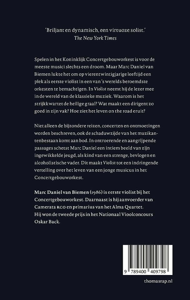 Spelen in het Koninklijk Concertgebouworkest is voor de meeste musici slechts een droom. Maar Marc Daniel van Biemen lukte het om op vierentwintigjarige leeftijd een plek als eerste violist in een van ’s werelds beroemdste orkesten te bemachtigen. In Violist neemt hij de lezer mee in de wereld van de klassieke muziek. Waarom is het strijkkwartet de heilige graal? Wat maakt een dirigent zo goed in zijn vak? Hoe ziet het leven on the road eruit? Maar ook de schaduwzijde van het muzikantenbestaan komt aan bod. In ontroerende en aangrijpende passages schetst Marc Daniel een intiem beeld van zijn ingewikkelde jeugd, als kind van een strenge, bevlogen en alcoholistische vader. Dit maakt Violist tot een indringende vertelling over het leven van een jonge musicus in het Concertgebouworkest.