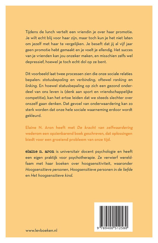 Dit voorbeeld laat de twee processen zien die onze sociale relaties bepalen: statusbepaling en verbinding, ofwel ranking en linking. En ook al is statusbepaling op zich een gezond onderdeel van ons leven (denk aan sport, en vriendschappelijke competitie), het kan als gevolg hebben dat we steeds slechter over onszelf gaan denken. Dat ondergewaardeerde ik kan zo sterk worden dat onze hele sociale waarneming erdoor wordt gekleurd. Elaine N. Aron schreef met De kracht van zelfwaardering opnieuw een opzienbarend boek dat oplossingen biedt voor wat een steeds groter probleem van onze tijd aan het worden is.