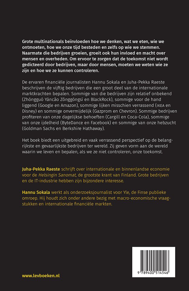 De ervaren financiële journalisten Hannu Sokala en Juha-Pekka Raeste beschrijven de vijftig bedrijven die een groot deel van de internationale marktkrachten bepalen. Sommige van die bedrijven zijn relatief onbekend (Zhongguó Yancao Zonggongsi en BlackRock), sommige voordehand liggend (Google en Amazon), sommige lijken misschien verrassend (Ikea en Disney) en sommige onvermijdelijk (Gazprom en Chevron). Sommige bedrijven profiteren van onze dagelijkse behoeften (Cargill en Coca-Cola), sommige van onze ijdelheid (ByteDance en Facebook) en sommige van onze hebzucht (Goldman Sachs en Berkshire Hathaway).