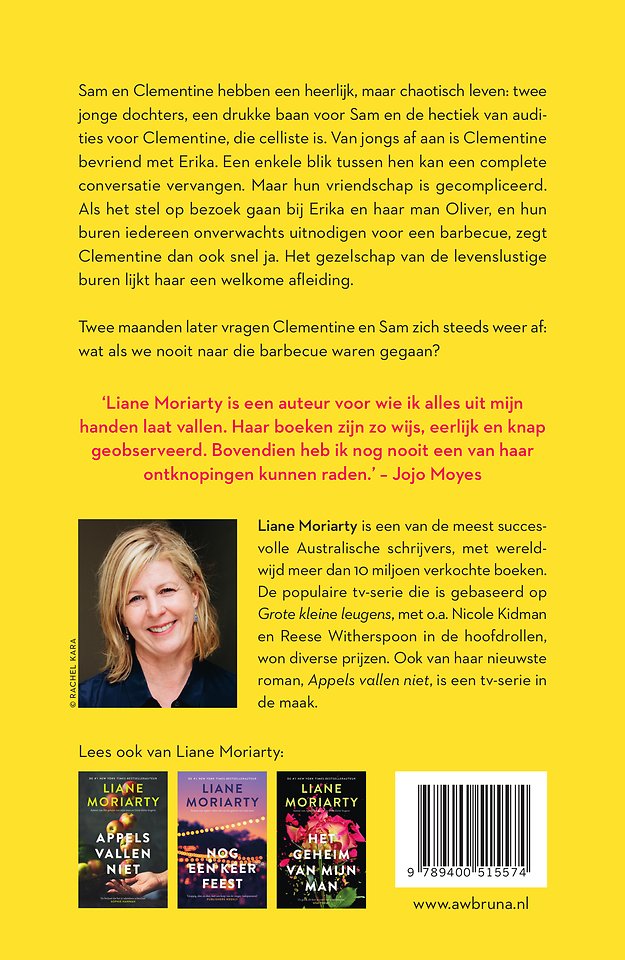 ‘Liane Moriarty is een auteur voor wie ik alles uit mijn handen laat vallen. Haar boeken zijn zo wijs, eerlijk en knap geobserveerd. Bovendien heb ik nog nooit een van haar ontknopingen kunnen raden.’ – Jojo Moyes
