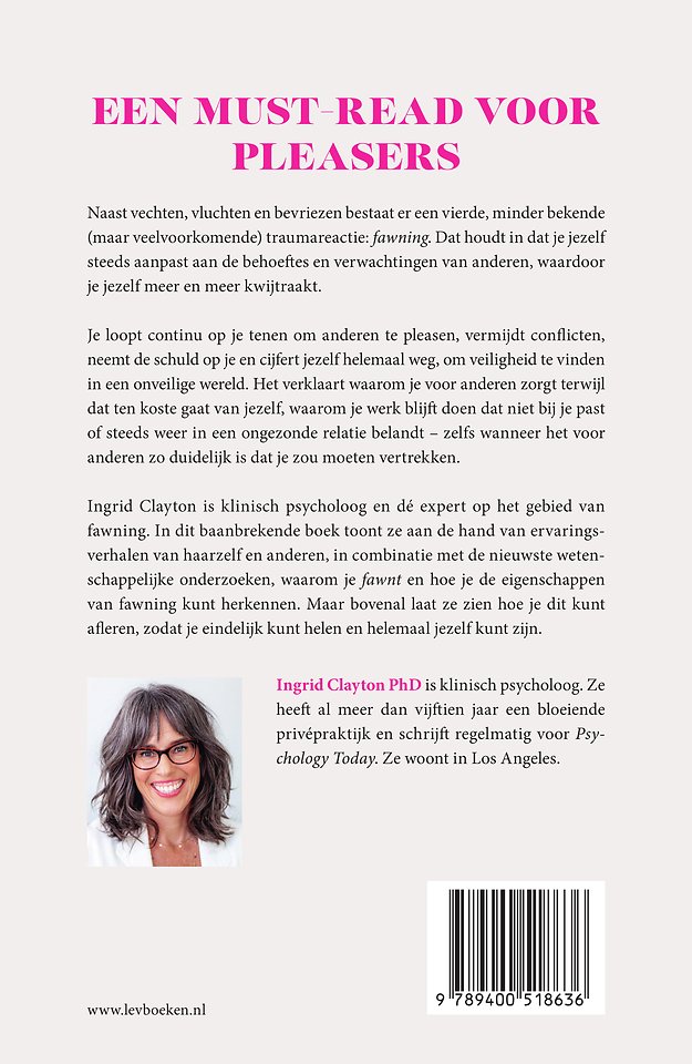 Ingrid Clayton is klinisch psycholoog en dé expert op het gebied van fawning. In dit baanbrekende boek toont ze aan de hand van ervaringsverhalen van haarzelf en anderen, in combinatie met de nieuwste wetenschappelijke onderzoeken, waarom je fawnt en hoe je de eigenschappen van fawning kunt herkennen. Maar bovenal laat ze zien hoe je dit kunt afleren, zodat je eindelijk kunt helen en helemaal jezelf kunt zijn.