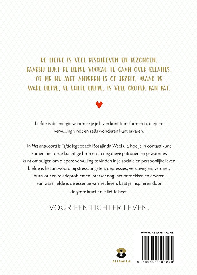 Liefde krijg je natuurlijk van je geliefden, maar échte liefde zit ook in jezelf. Het is een krachtige bron, die voor iedereen beschikbaar is. In Het antwoord is liefde laat Rosalinda Weel zien hoe je met deze bron in contact komt. Zo kun je negatieve gewoontes en patronen ombuigen. Met liefde, positief denken en goede energie kun je alle angsten overwinnen.