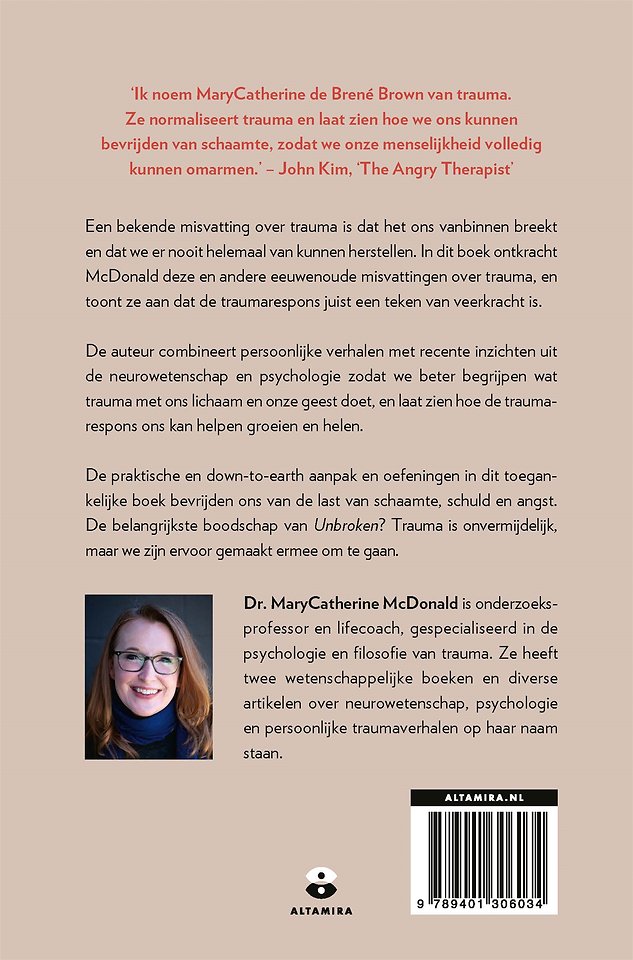 Veel mensen denken dat trauma ons gebroken achterlaat. In 'Unbroken' wordt deze misvatting door Dr. MaryCatherine McDonald onder de loep genomen. Trauma breekt ons namelijk helemaal niet; de manier waarop we op trauma reageren (onze traumarespons) laat juist zien hoe veerkrachtig we zijn. Door middel van persoonlijke verhalen, gecombineerd met inzichten uit de neurowetenschap en psychologie, laat McDonald zien wat trauma met onze geest én met ons lichaam doet. En bovenal laat ze zien hoe de traumarespons ons kan helpen groeien en helen. Haar praktische en toegankelijke aanpak en oefeningen helpen je jezelf te bevrijden van gevoelens die met trauma gepaard gaan, waaronder schaamte, schuld en angst. 'Unbroken' is een boek vol hoop, dat ons vertelt dat hoewel trauma onvermijdelijk is, we gemaakt zijn om ermee om te gaan.
