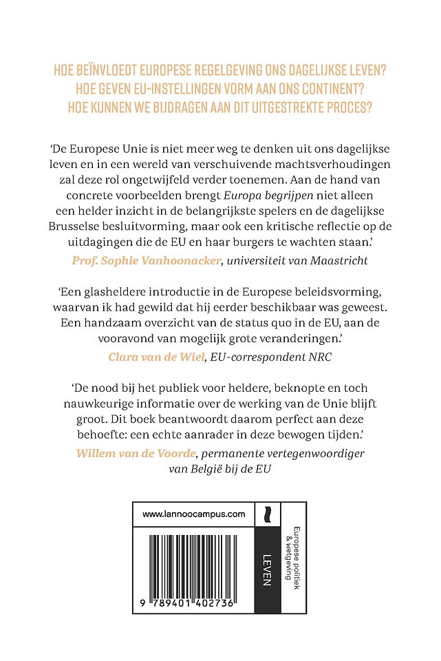 De Europese Unie is niet meer weg te denken uit ons dagelijkse leven en in een wereld van verschuivende machtsverhoudingen zal deze rol ongetwijfeld verder toenemen. Aan de hand van concrete voorbeelden brengt Europa begrijpen niet alleen een helder inzicht in de belangrijkste spelers en de dagelijkse Brusselse besluitvorming, maar ook een kritische reflectie op de uitdagingen die de EU en haar burgers te wachten staan. - Prof. Sophie Vanhoonacker, universiteit van Maastricht