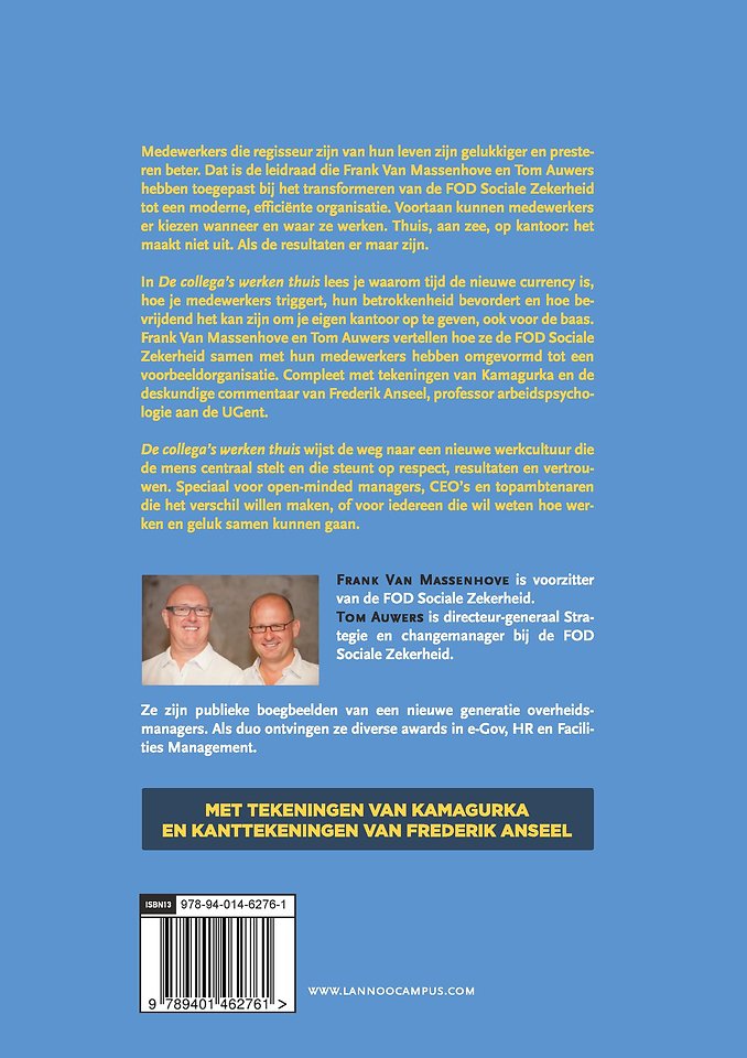 In 'De collega's werken thuis' lees je waarom tijd de nieuwe currency is, hoe je medewerkers triggert, hun betrokkenheid bevordert en hoe bevrijdend het kan zijn om uw eigen kantoor op te geven, ook voor de baas. Frank Van Massenhove en Tom Auwers vertellen hoe ze de FOD Sociale Zekerheid samen met hun medewerkers hebben omgevormd tot een voorbeeldorganisatie. Compleet met tekeningen van Kamagurka en de deskundige commentaar van Frederik Anseel, professor arbeidspsychologie aan de UGent.