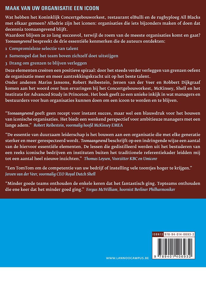 Hoe kon het Koninklijk Concertgebouworkest uitgroeien tot een onbetwiste vaste waarde in de top drie van beste orkesten ter wereld? En vooral: hoe blijft het aan de top? Het Koninklijk Concertgebouworkest (KCO) bestaat in 2013 125 jaar. Het werd in 2008 uitgeroepen tot het beste orkest ter wereld door het internationaal vermaarde muziekblad Gramophone, met op twee en drie het Berliner en het Wiener Philharmoniker. Wat zijn de parallellen met andere toporganisaties, zoals enkele toprestaurants, een paar sportclubs en bedrijven die de tand des tijds goed doorstaan. Die inzichten zijn direct toepasbaar voor de hedendaagse managers in het bedrijfsleven.