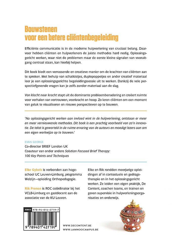 Dit boek biedt een verrassende en creatieve manier om de krachten van cliënten aan te spreken. Met behulp van schatkistjes, duplopoppetjes en ander creatief materiaal leer je een oplossingsgerichte begeleidingssessie uit te werken. Dankzij de vele perspectiefgevende vragen kan je zelfs zonder materiaal aan de slag.