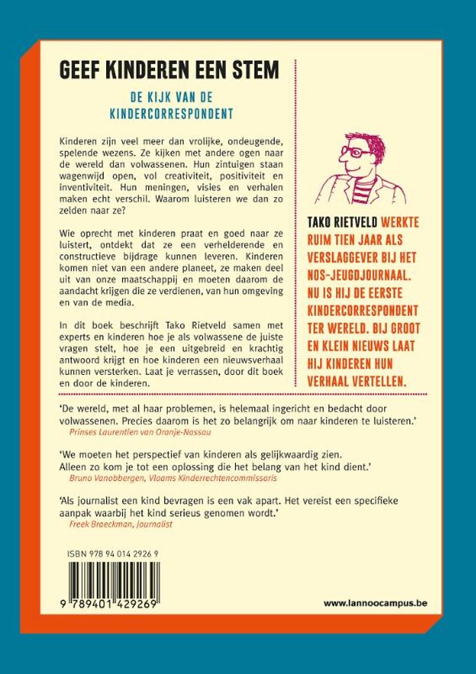 De kijk van de kindercorrespondent Kinderen zijn veel meer dan vrolijke, ondeugende, spelende wezens. Ze kijken met andere ogen naar de wereld dan volwassenen. Hun zintuigen staan wagenwijd open, vol creativiteit, positiviteit en inventiviteit. Hun meningen, visies en verhalen maken echt verschil. Waarom luisteren we dan zo zelden naar ze? Wie oprecht met kinderen praat en goed naar ze luistert, ontdekt dat ze een verhelderende en constructieve bijdrage kunnen leveren. Kinderen komen niet van een andere planeet, ze maken deel uit van onze maatschappij en moeten daarom de aandacht krijgen die ze verdienen, van hun omgeving en van de media. In dit boek beschrijft Tako Rietveld samen met experts en kinderen hoe je als volwassene de juiste vragen stelt, hoe je een uitgebreid en krachtig antwoord krijgt en hoe kinderen een nieuwsverhaal kunnen versterken. Laat je verrassen, door dit boek en door de kinderen. 'De wereld, met al haar problemen, is helemaal ingericht en bedacht door volwassenen. Precies daarom is het zo belangrijk om naar kinderen te luisteren.' Prinses Laurentien van Oranje-Nassau 'We moeten het perspectief van kinderen als gelijkwaardig zien. Alleen zo kom je tot een oplossing die het belang van het kind dient.' Bruno Vanobbergen, Vlaams Kinderrechtencommissaris 'Als journalist een kind bevragen is een vak apart. Het vereist een specifieke aanpak waarbij het kind serieus genomen wordt.' Freek Braeckman, journalist