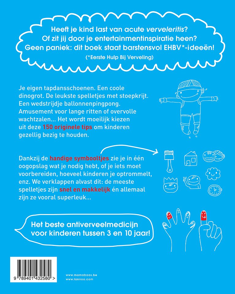 150 topideetjes voor saaie momenten Heeft je kind last van acute verveleritis? Of zit jij door je entertainmentinspiratie heen? Geen paniek: dit boek staat barstensvol EHBV*-ideeën! (*Eerste Hulp Bij Verveling) Je eigen tapdansschoenen. Een coole dinogrot. De leukste spelletjes met stoepkrijt. Een wedstrijdje ballonnenpingpong. Amusement voor lange ritten of overvolle wachtzalen... Het wordt moeilijk kiezen uit deze 150 originele tips om kinderen gezellig bezig te houden. Dankzij de handige symbooltjes zie je in één oogopslag wat je nodig hebt, of je iets moet voorbereiden, hoeveel kinderen je optrommelt, enz. We verklappen alvast dit: de meeste spelletjes zijn snel en makkelijk én allemaal zijn ze vooral superleuk... Het beste antiverveelmedicijn voor kinderen tussen 3 en 10 jaar!