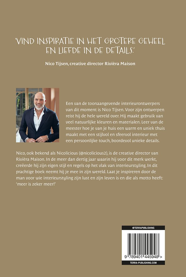 Nico, ook bekend als Nicolicious, is de creative director van Rivièra Maison. In de meer dan dertig jaar waarin hij voor dit merk werkt, creëerde hij zijn eigen stijl en regels op het vlak van interieurstyling. In dit prachtige boek neemt hij je mee in zijn wereld. Laat je inspireren door de man voor wie interieurstyling zijn lust en zijn leven is en die als motto heeft: 'meer is zeker meer!'