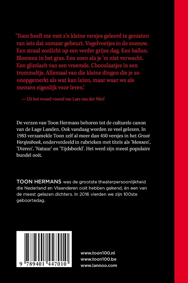 De verzen van Toon Hermans behoren tot de culturele canon van de Lage Landen. Ook vandaag worden ze veel gelezen. In 1983 verzamelde Toon zelf al meer dan 450 versjes in het Groot Versjesboek, onderverdeeld in rubrieken met titels als 'Mensen', 'Dieren', 'Natuur' en 'Tijdsbeeld'. Het werd zijn meest populaire bundel ooit.