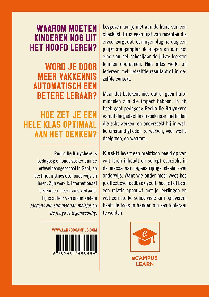 'Klaskit' levert een praktisch beeld op van wat leren inhoudt en schept overzicht in de massa aan tegenstrijdige ideeën over onderwijs. Want wie weet hoe je onder meer effectieve feedback geeft, hoe je het best een relatie opbouwt met je leerlingen en wat een sterke schoolvisie kan opleveren, heeft de tools in handen om een topleraar te worden.