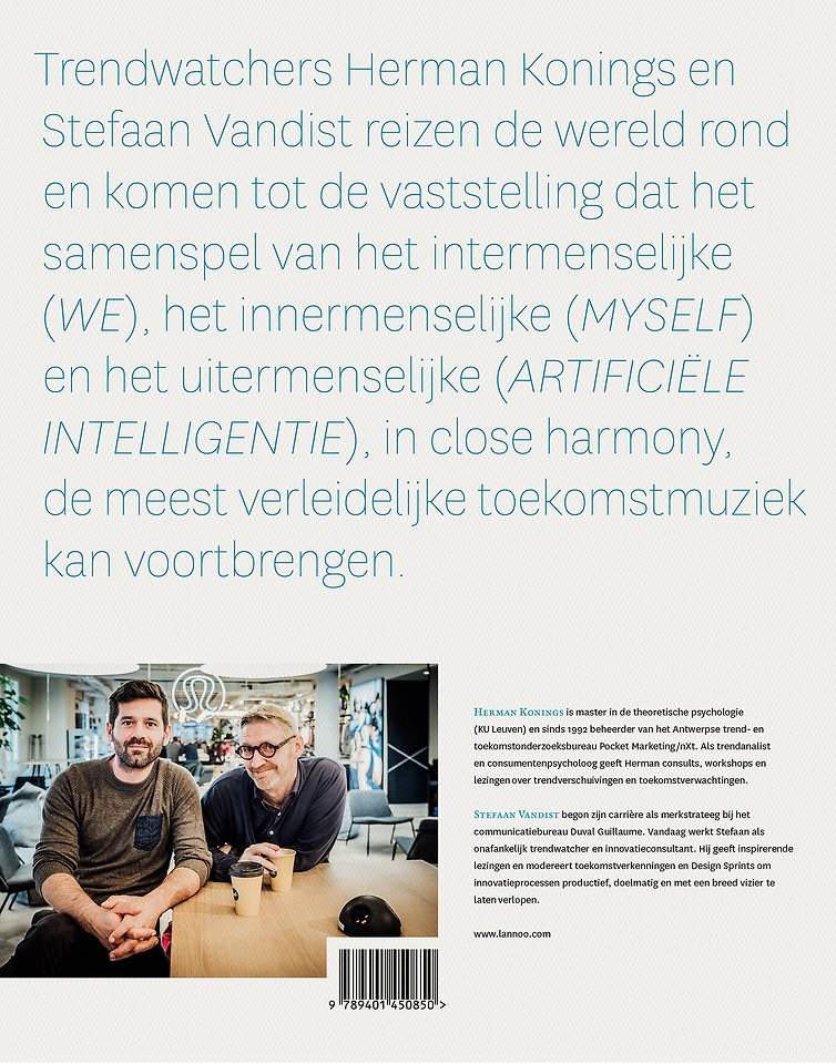 Trendwatchers Herman Konings en Stefaan Vandist reizen de wereld rond en komen tot de vaststelling dat het samenspel van het intermenselijke (WE), het innermenselijke (MYSELF) en het uitermenselijke (ARTIFICIËLE INTELLIGENTIE), in close harmony, de meest verleidelijke toekomstmuziek kan voortbrengen.