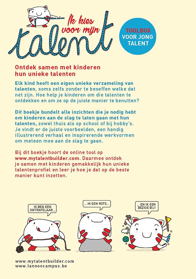 Bij dit boekje hoort de online tool op www.mytalentbuilder.com. Daarmee ontdek je samen met kinderen gemakkelijk hun unieke talentenprofiel en leer je hoe je dat op de beste manier kunt inzetten.