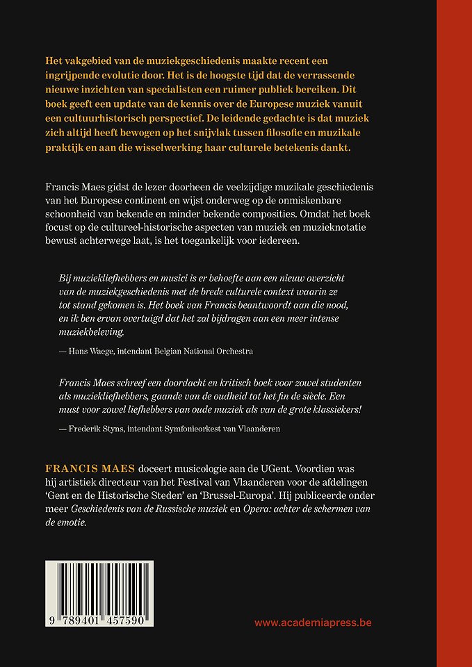 Het vakgebied van de muziekgeschiedenis maakte recent een ingrijpende evolutie door. Het is de hoogste tijd dat de verrassende nieuwe inzichten van specialisten een ruimer publiek bereiken. Dit boek geeft een update van de kennis over de Europese muziek vanuit een cultuurhistorisch perspectief. De leidende gedachte is dat muziek zich altijd heeft bewogen op het snijvlak tussen filosofie en muzikale praktijk en aan die wisselwerking haar culturele betekenis dankt.