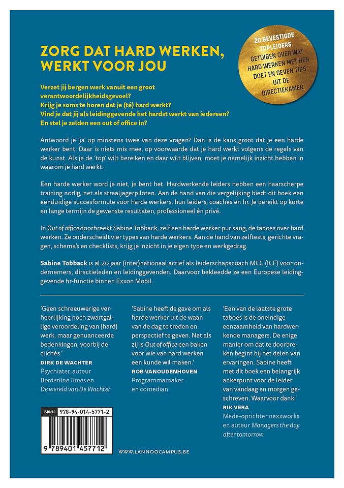 In 'Out of Office' doorbreekt Sabine Tobback, zelf een harde werker pur sang, de taboes over hard werken. Ze onderscheidt vier types van harde werkers. Aan de hand van zelftests, gerichte vragen, schema's en checklists, krijg je inzicht in je eigen type en werkgedrag