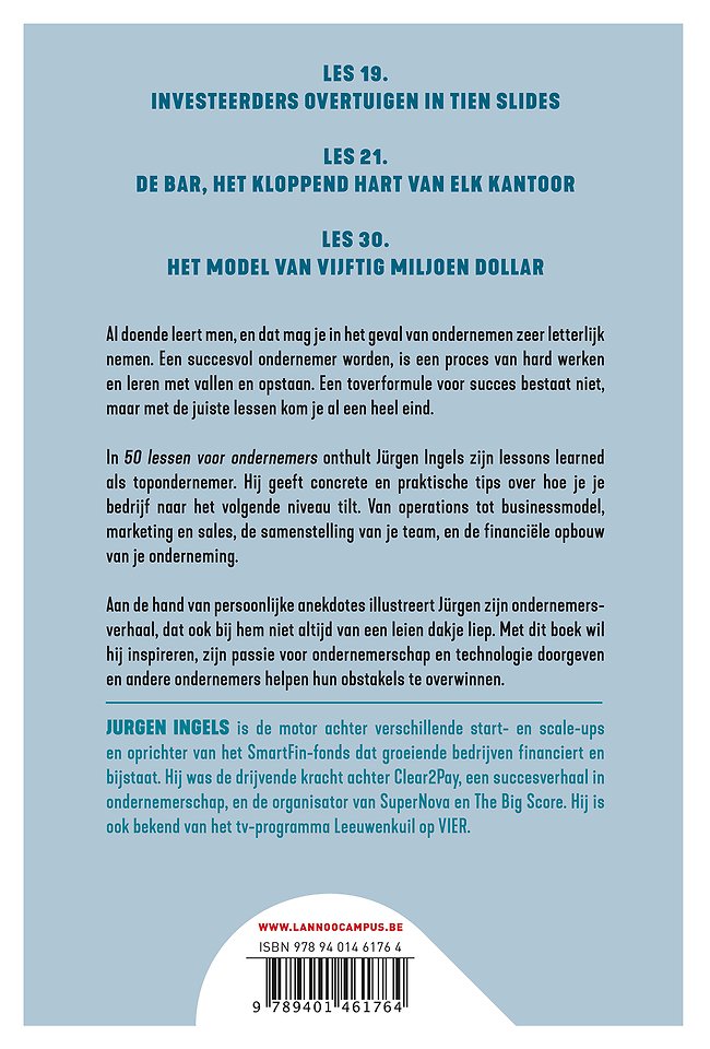 In 50 lessen voor ondernemers onthult Jürgen Ingels zijn lessons learned als topondernemer. Hij geeft concrete en praktische tips over hoe je je bedrijf naar het volgende niveau tilt. Van operations tot businessmodel, marketing en sales, de samenstelling van je team, en de financiële opbouw van je onderneming.