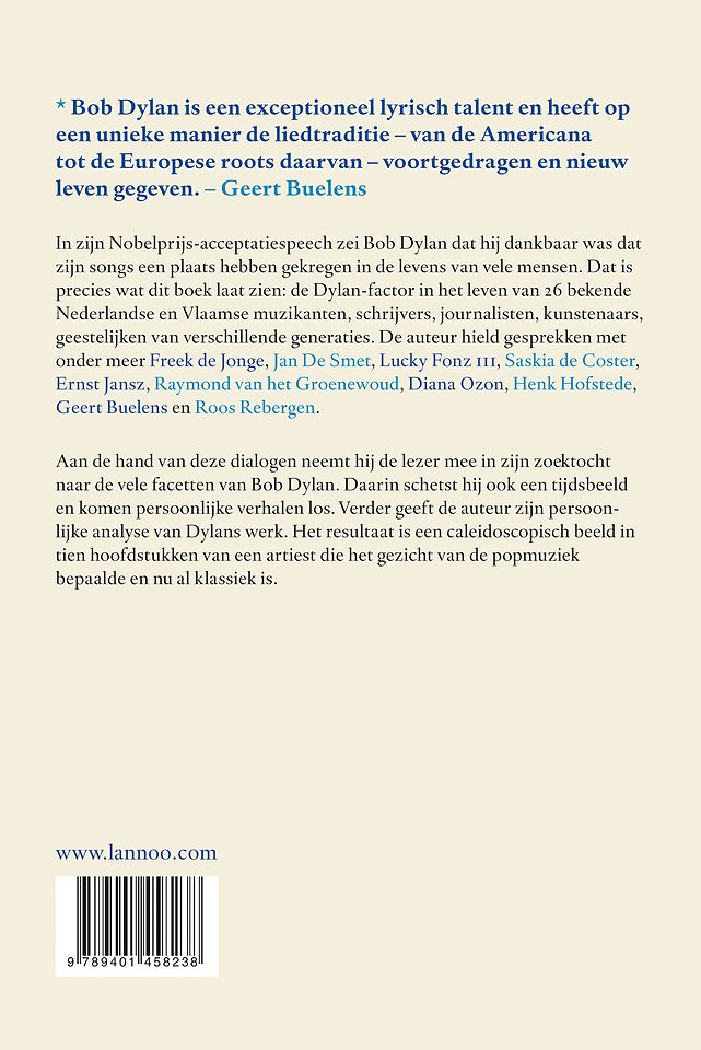 In zijn Nobelprijs-acceptatiespeech zei Bob Dylan dat hij dankbaar was dat zijn songs een plaats hebben gekregen in de levens van vele mensen. Dat is precies wat dit boek laat zien: de Dylan-factor in het leven van 26 Nederlandse en Vlaamse muzikanten, schrijvers, journalisten, kunstenaars en geestelijken van verschillende generaties. De auteur hield gesprekken met onder meer Freek de Jonge, Jan De Smet, Lucky Fonz III, Saskia De Coster, Ernst Jansz, Raymond van het Groenewoud, Henk Hofstede en Roos Rebergen.