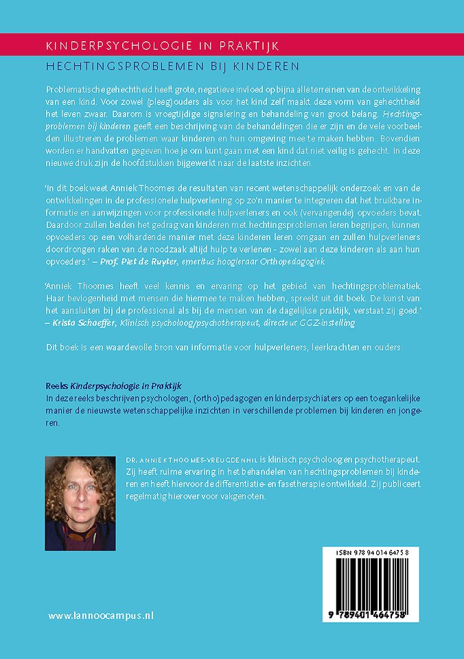 Niet alleen het kind ondervindt hiervan de gevolgen: ook voor zijn omgeving is dit van grote invloed. Daarom is vroegtijdige signalering en behandeling van problematische gehechtheid van groot belang. Dit boek geeft de lezer praktische tips om hechtingsproblemen bij kinderen aan te pakken. Het boek is gebaseerd op de recentste wetenschappelijke kennis over hechtingsproblemen en is daarmee een waardevolle bron van informatie voor psychologen, orthopedagogen en andere hulpverleners die met hechtingsproblemen bij kinderen te maken hebben. Dankzij de heldere uitleg is dit boek ook zeer toegankelijk voor leerkrachten en geïnteresseerde ouders. Voor wie nog meer wil weten, biedt Hechtingsproblemen bij kinderen verdiepende literatuur, relevante adressen en websites.