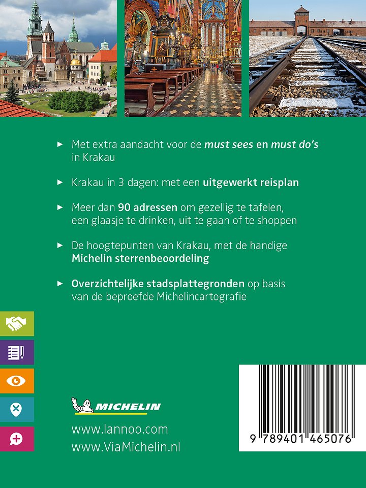 Met extra aandacht voor de must sees en must do's in Krakau Krakau in 3 dagen: met een uitgewerkt reisplan Meer dan 90 adressen om gezellig te tafelen, een glaasje te drinken, uit te gaan of te shoppen De hoogtepunten van Krakau, met de handige Michelin sterrenbeoordeling Overzichtelijke stadsplattegronden op basis van de beproefde Michelincartografie
